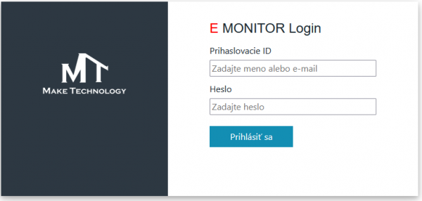 Pre prihlásenie do aplikácie E-Monitor je potrebne do polí Prihlasovacie ID a Heslo zadať prihlasovacie údaje, ktoré ste obdržali od Vášho dodávateľa riešenia a kliknúť na tlačítko Prihlásiť sa