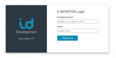 Pre prihlásenie do aplikácie E-Monitor je potrebne do polí Prihlasovacie ID a Heslo zadať prihlasovacie údaje, ktoré ste obdržali od Vášho dodávateľa riešenia.